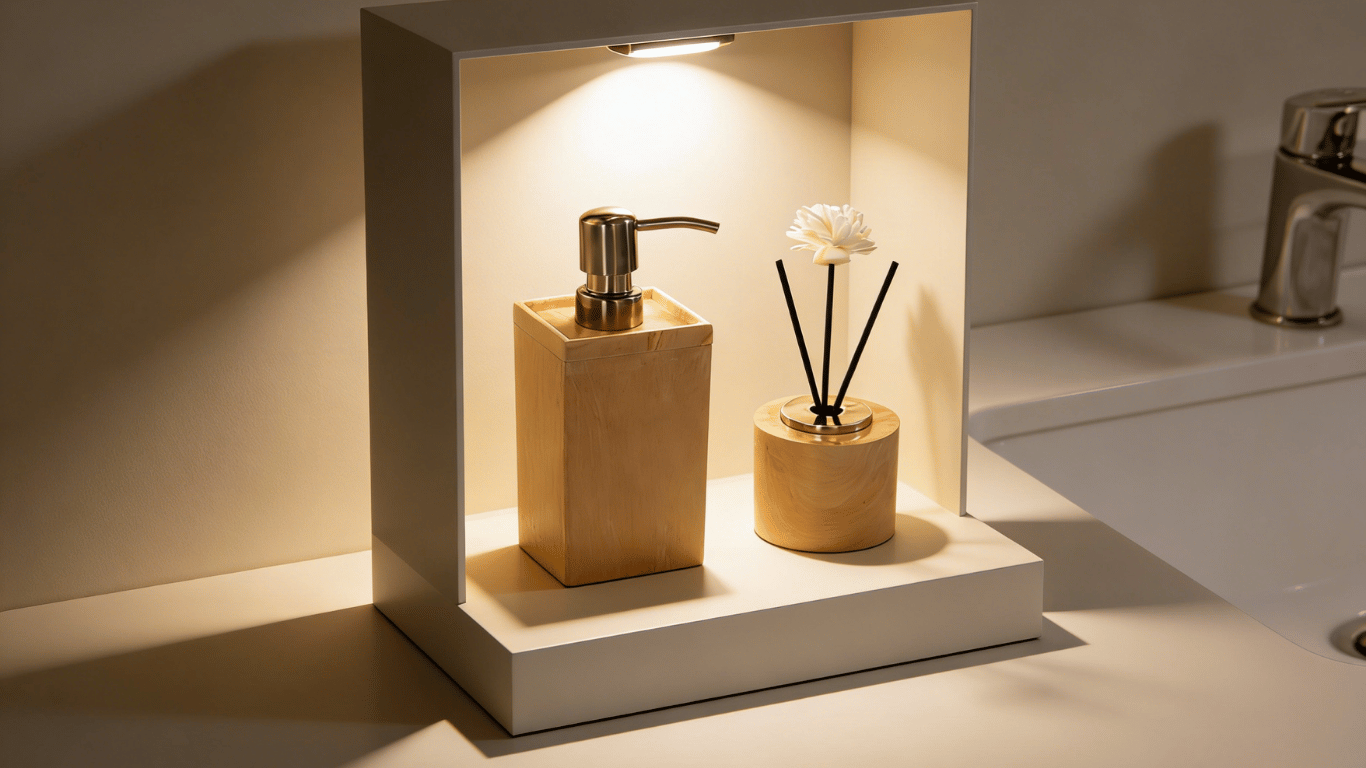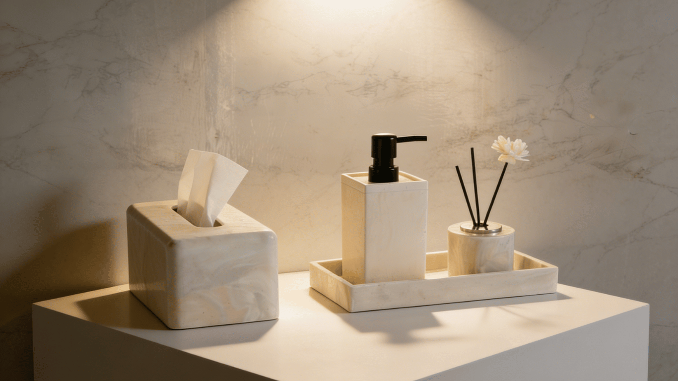 Premium BMC accessories for hotels and homes, including lotion bottles, soap dishes, trays, toothbrush holders, cotton boxes, and more.